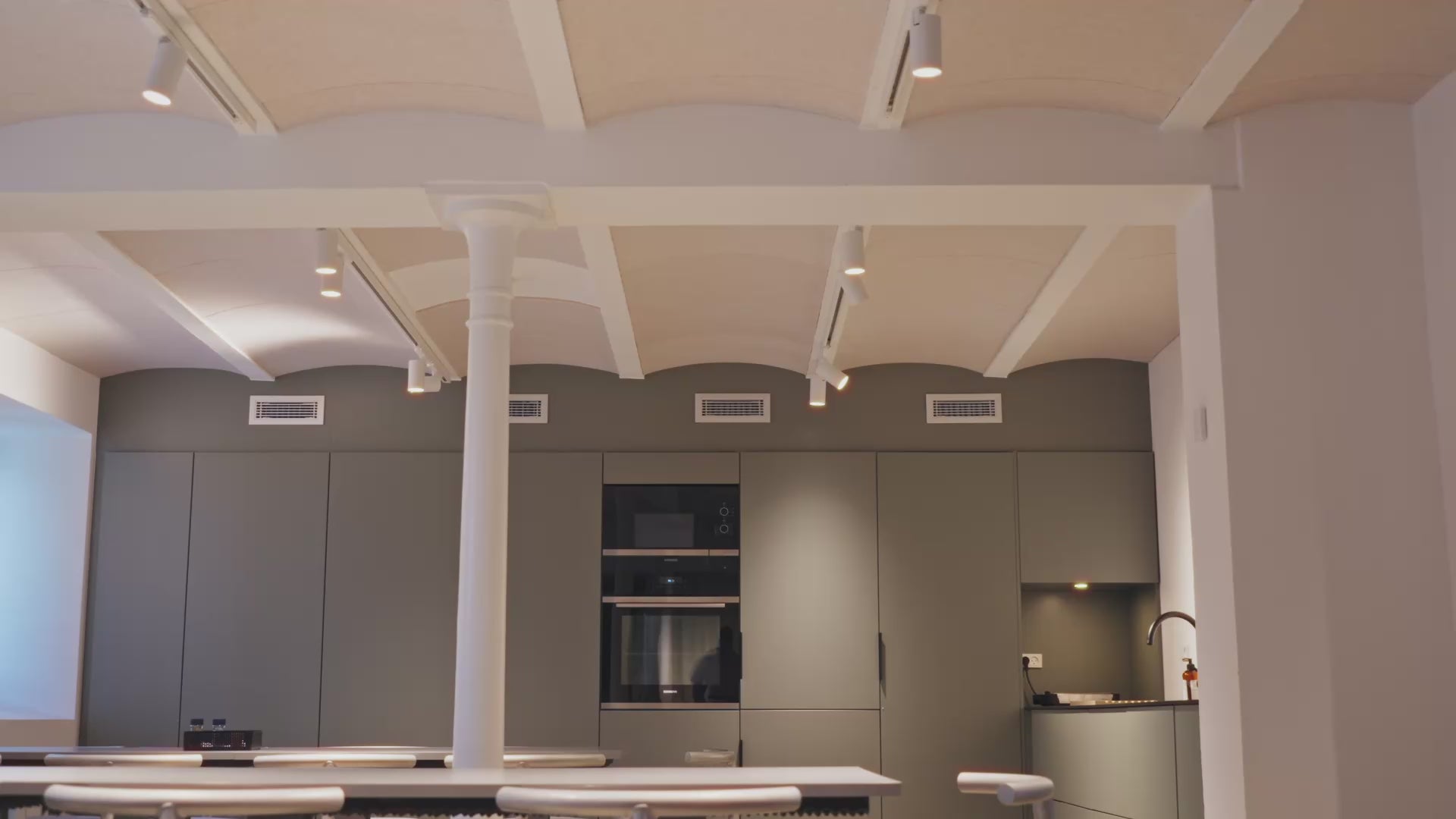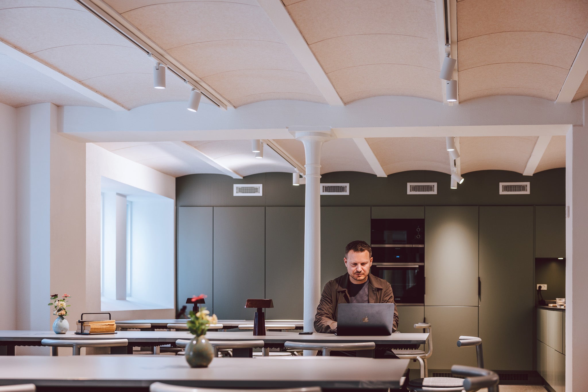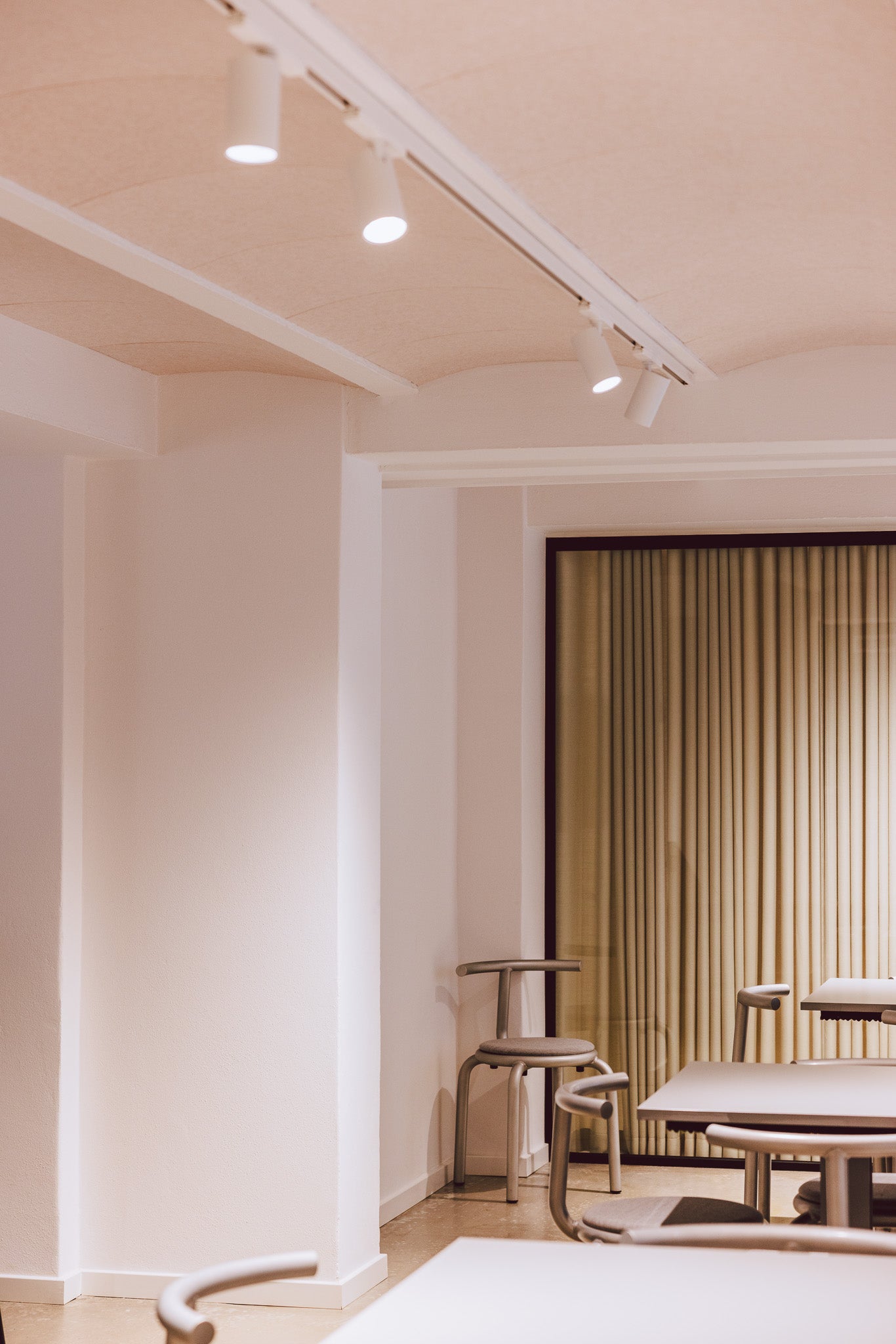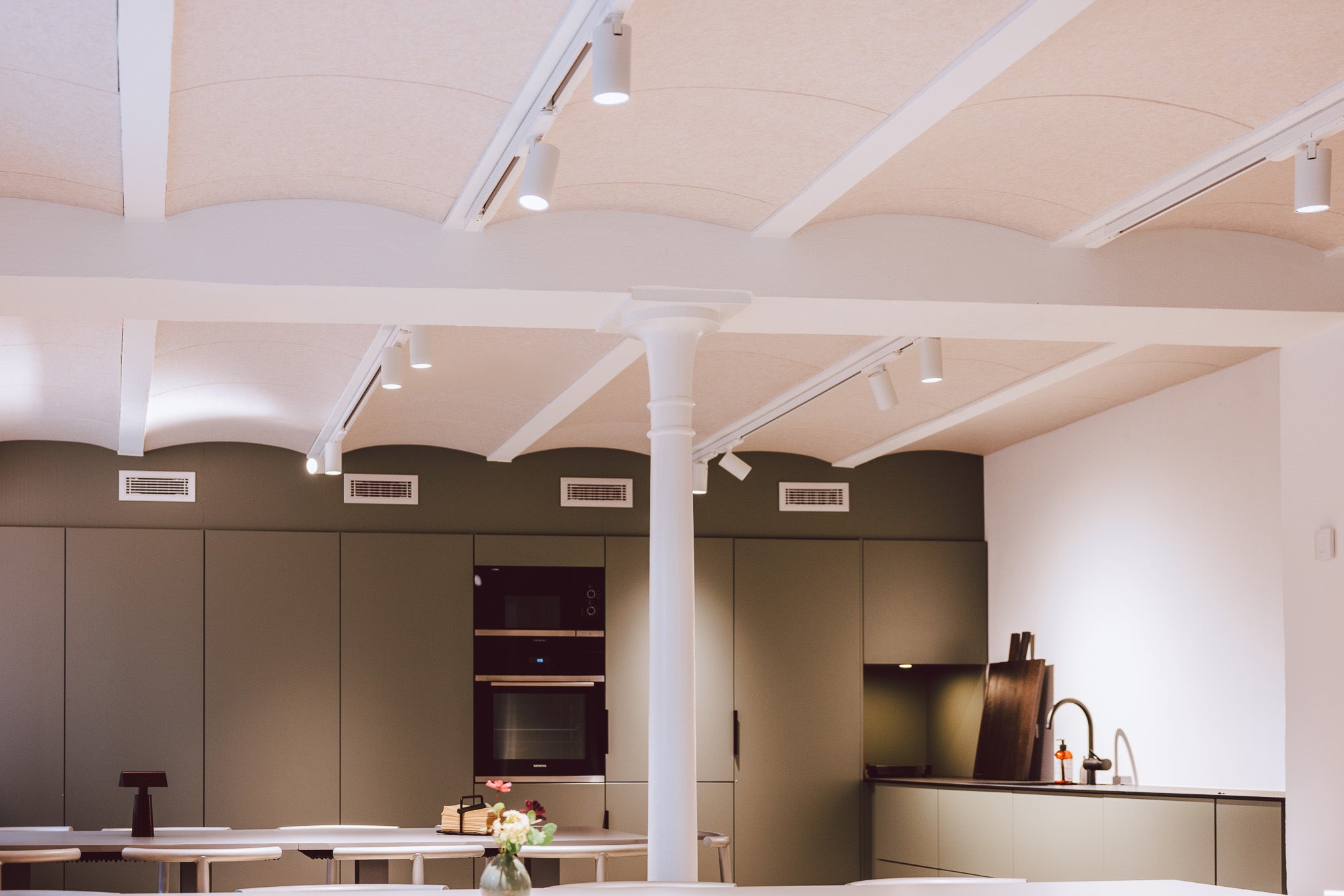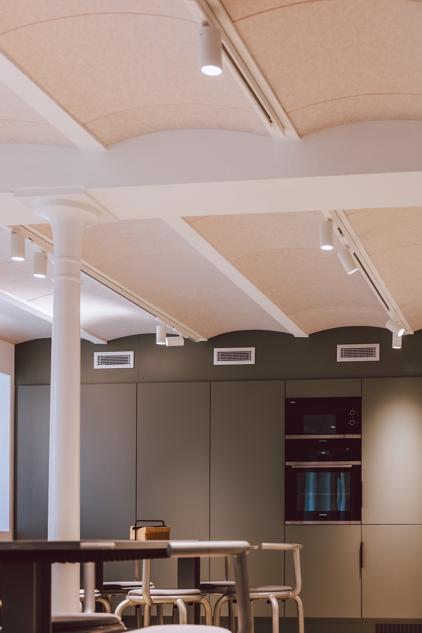 Med udgangspunkt i de eksisterende buede hvælvinger udviklede vi en tilpasset version af vores akustikloftpaneler. Panelerne blev formet og monteret på en måde, så de følger rummets originale arkitektur – uden at ændre på helhedsindtrykket.
