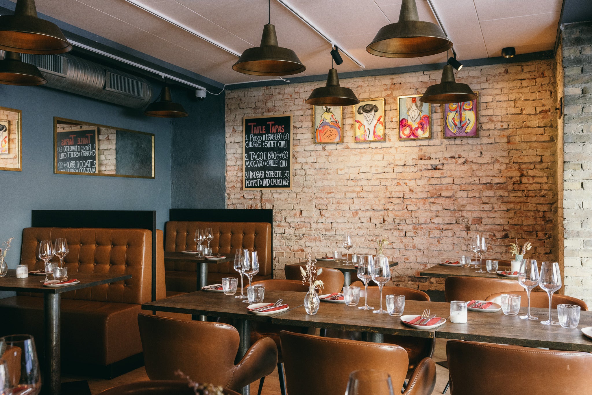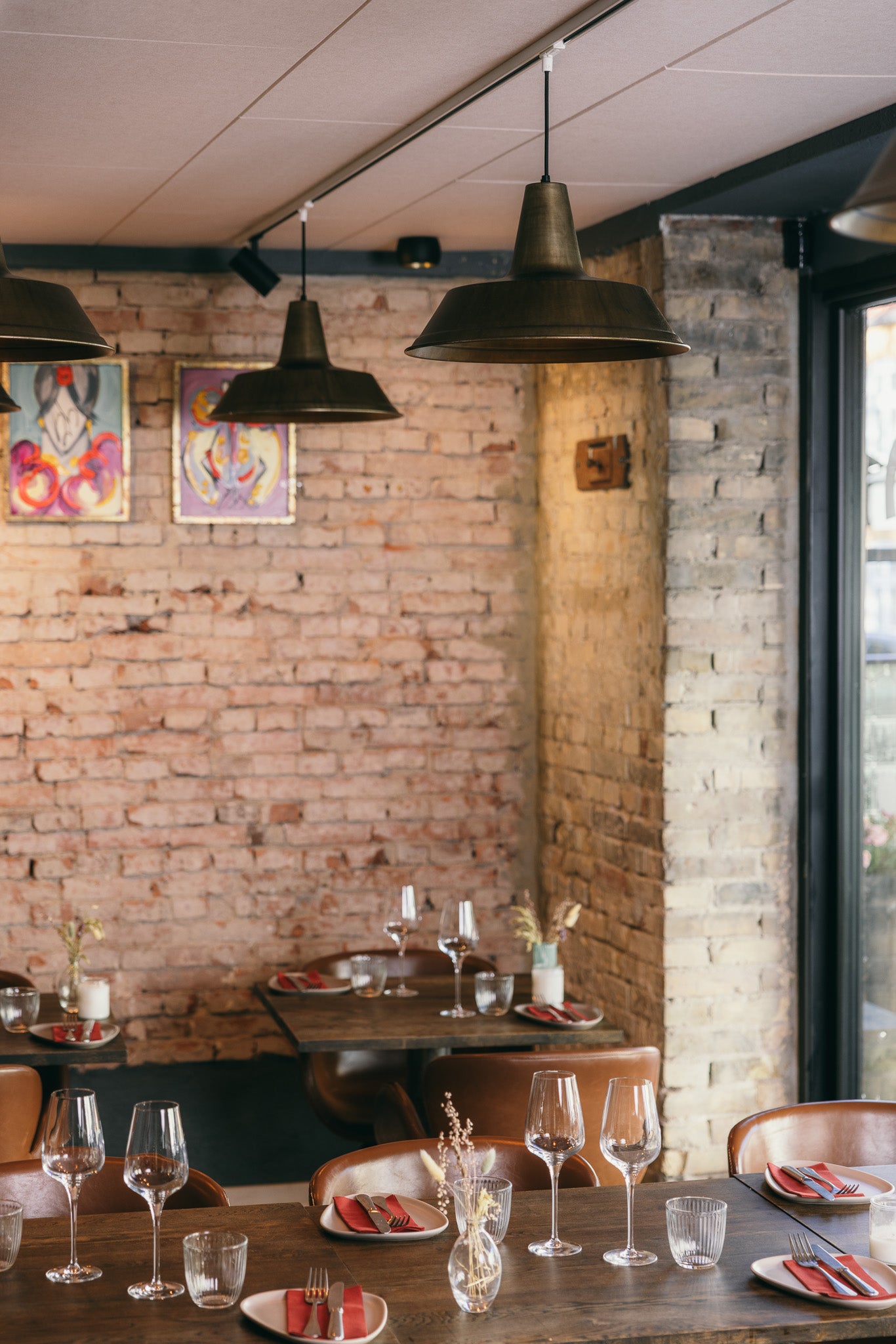 Restauranter er ofte præget af hårde overflader: murstensvægge, glas og træborde. Det giver lang efterklang og en høj lyd, der gør det svært at føre en afslappet samtale. Her ønskede man en løsning, der kunne forbedre akustikken – uden at ændre det rå og hyggelige udtryk.
